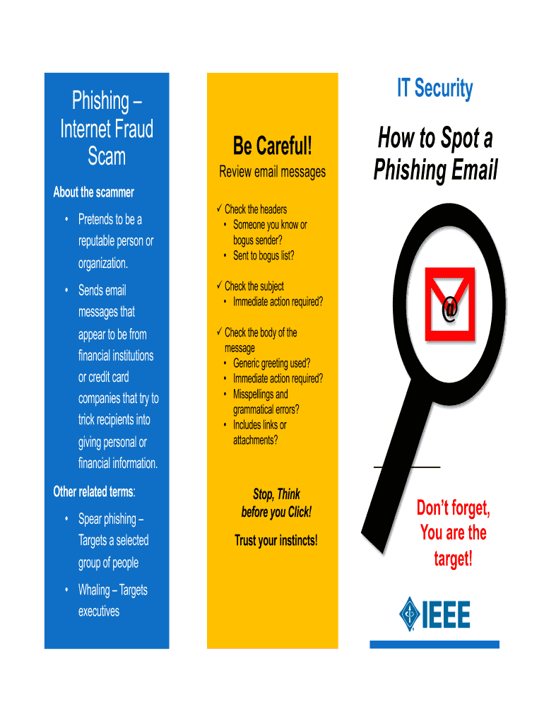 Phishing Internet Fraud Scam IT Security Be Careful! Review email messagesAbout the scammer Pretends to be a reputable person or organization. Sends email messages that appear to be from financial