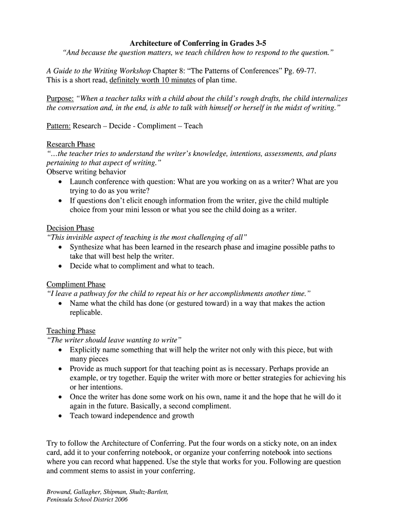A Guide to the Writing Workshop Chapter 8: The Patterns of Conferences Pg.