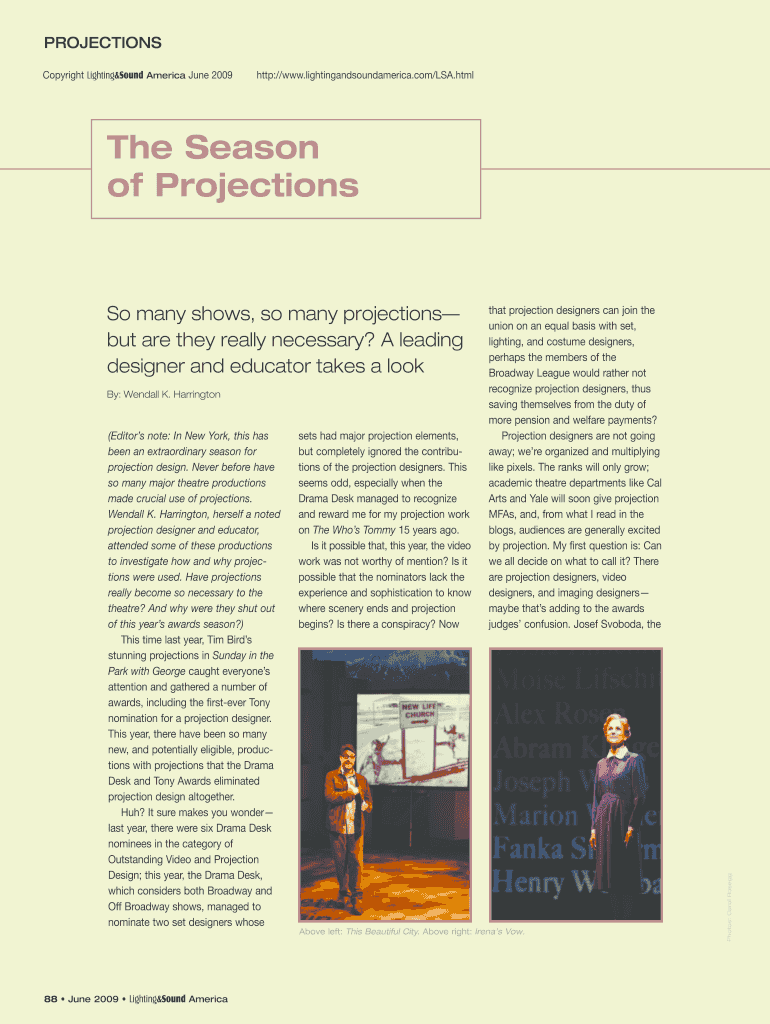 PROJECTIONS Copyright Lighting&Sound America June 2009http://www.lightingandsoundamerica.com/LSA.htmlThe Season of Projections: Kendall K. Harrington(Editors note: In New York, this has been an extraordinary