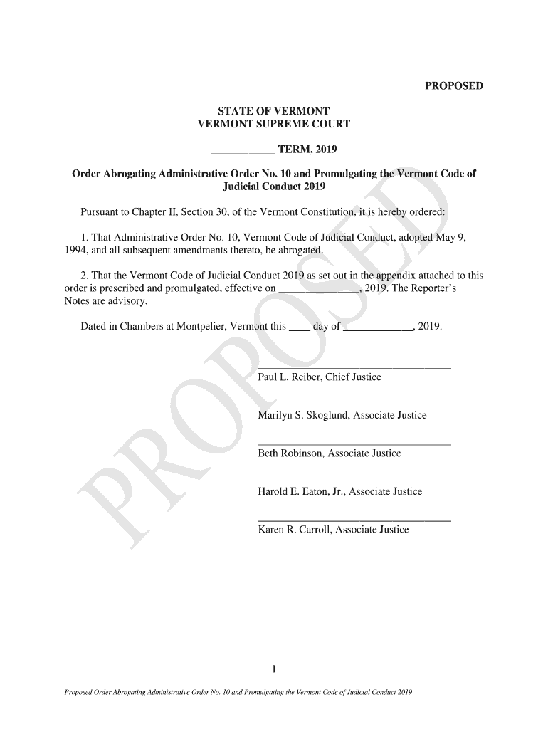 PROPOSED STATE OF VERMONT SUPREME COURT TERM, 2019 Order Abrogating Administrative Order No. 10 and Promulgating the Vermont Code of Judicial Conduct 2019 Pursuant to Chapter II, Section 30, of the