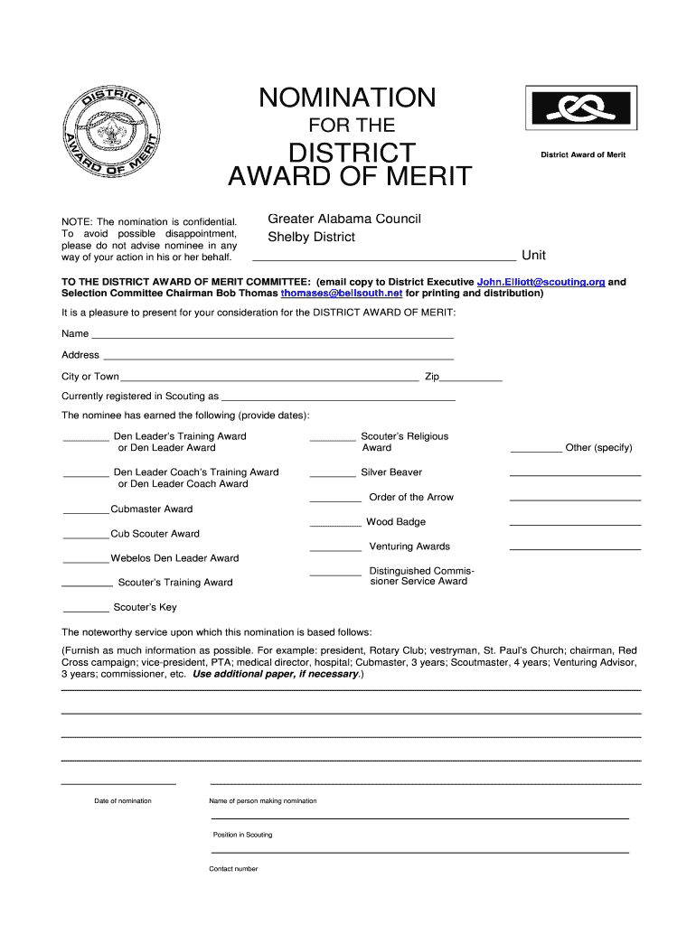 Get the free TO THE DISTRICT AWARD OF MERIT COMMITTEE: (email copy to District Executive John
