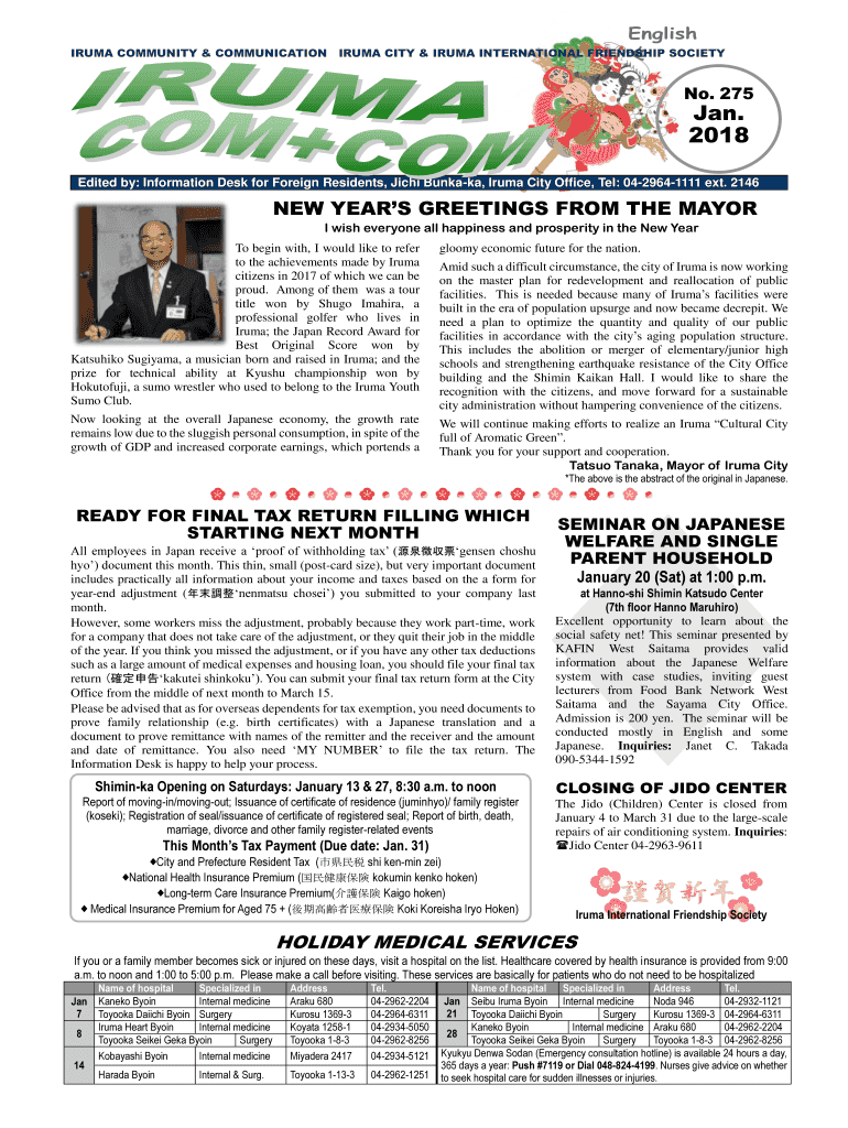 IRMA COMMUNITY & COMMUNICATIONIRUMA CITY & IRMA INTERNATIONAL FRIENDSHIP SOCIETY No. 275Jan. 2018Edited by: Information Desk for Foreign Residents, Rich Bunk aka, Irma City Office, Tel: 0429641111