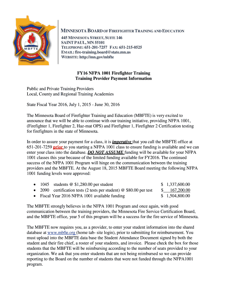 MINNESOTA BOARD OF FIREFIGHTER TRAINING AND EDUCATION 445 MINNESOTA STREET, SUITE 146 SAINT PAUL, MN 55101 TELEPHONE: 6512017257 FAX: 6512150525 EMAIL: fire training. Board state.MN.us WEBSITE: http://mn.gov/mbfteFY16