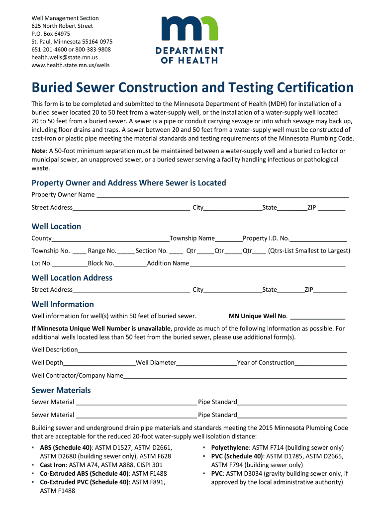 Get the free Buried Sewer Construction and Testing Certification. Form to be completed and submit...