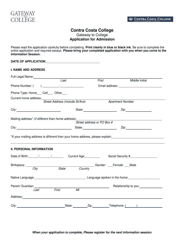 Contra Costa College Gateway to College Application for Admission Please read the application carefully before completing. Print clearly in blue or black ink. Be sure to complete the entire application