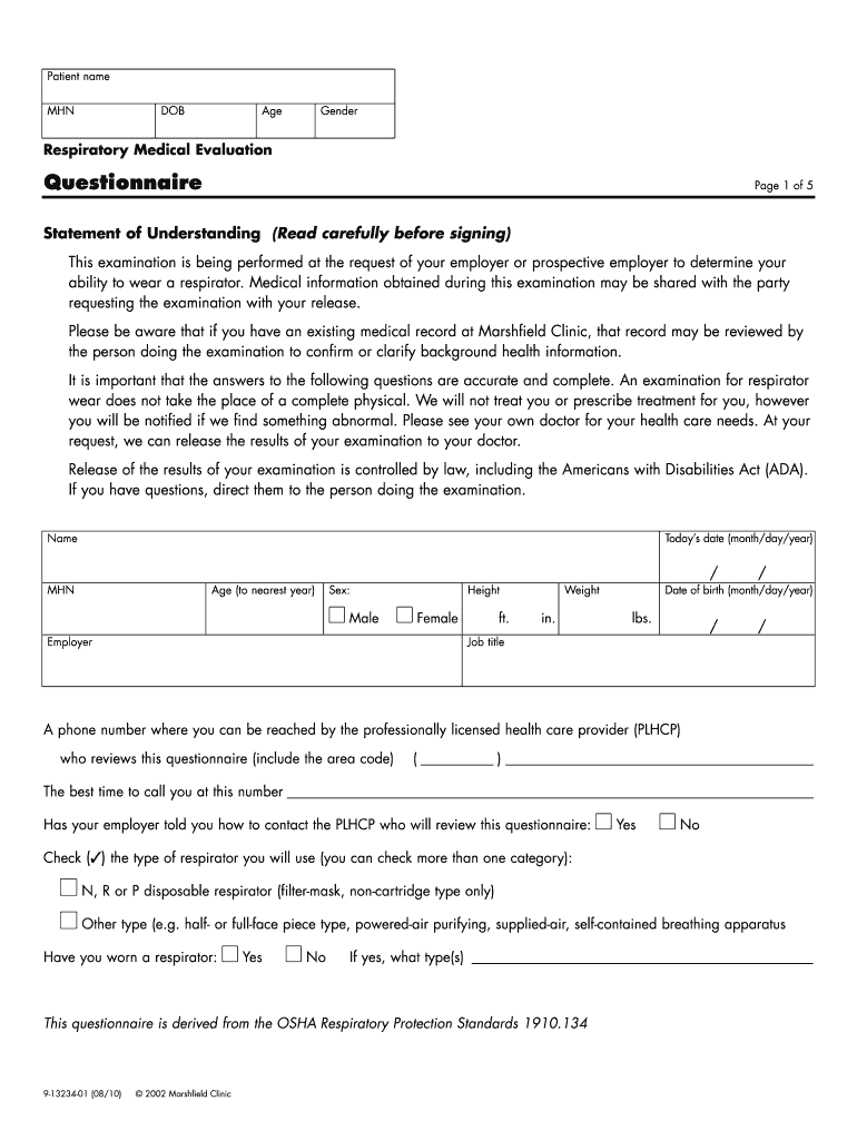 Get the free Respiratory Questionnaire - Marshfield Clinic