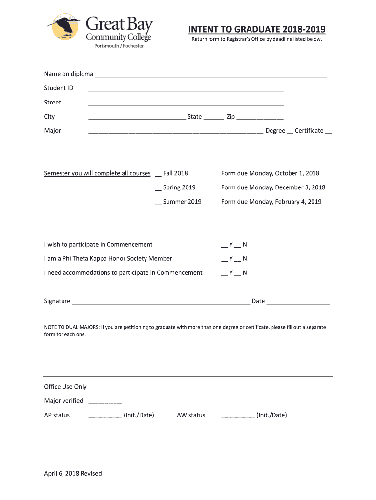 INTENT TO GRADUATE 20182019 Return form to Registrars Office by deadline listed below. Name on diploma Student ID Street City State Zip Major Degree Certificate Semester you will complete all courses