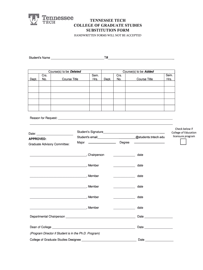 TENNESSEE TECH COLLEGE OF GRADUATE STUDIES SUBSTITUTION FORM HANDWRITTEN FORMS WILL NOT BE ACCEPTEDStudent's Name T# Course(s) to be Deleted Dept. Cr's. No. Course Telecourse(s) to be Added SEM. Hrs.