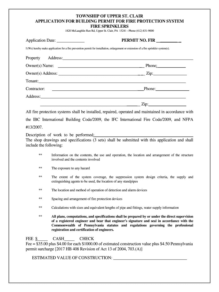 Get the free Fire sprinkler permit FORM/PERMIT - Upper St. Clair Township