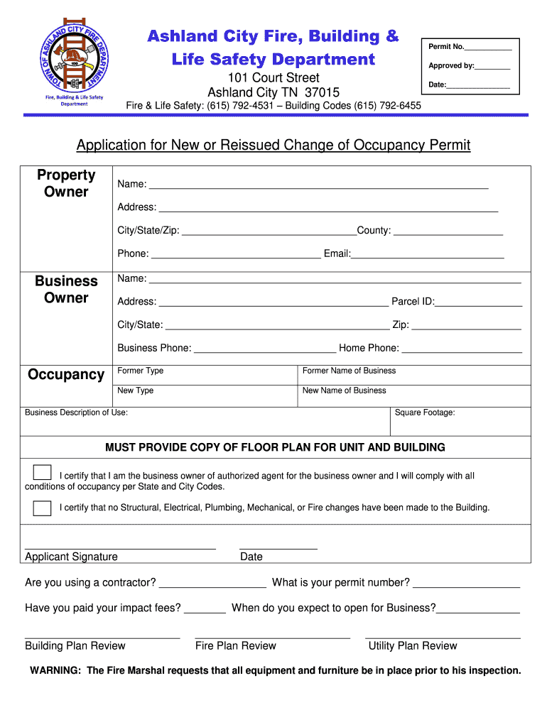 Ashland City Fire, Building & Life Safety DepartmentPermit No. 101 Court Street Ashland City TN 37015Date: Approved by: Fire & Life Safety: (615) 7924531 Building Codes (615) 7926455Application for