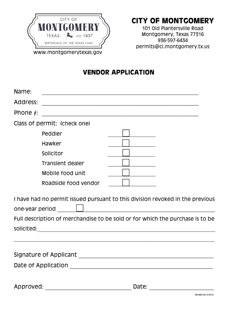 CITY OF Montgomery.montgomerytexas.gov101 Old Cartersville Road Montgomery, Texas 77316 9365976434 permit sci. Montgomery.TX.vendor APPLICATION Name: Address: Phone #: Class of permit: (check one)