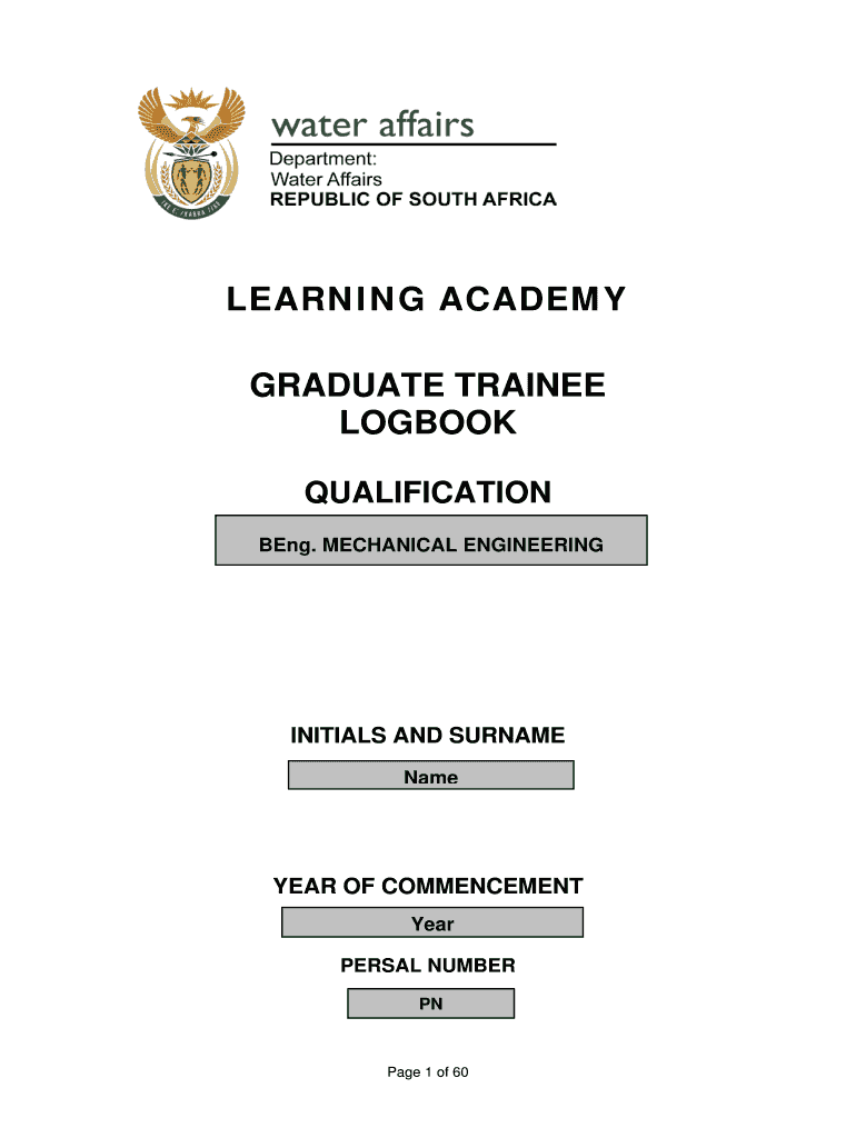 LEARNING ACADEMY GRADUATE TRAINEE LOGBOOK QUALIFICATION B.Eng. MECHANICAL ENGINEERING INITIALS AND SURNAME Name YEAR OF COMMENCEMENT Year PERUSAL NUMBER PNP age 1 of 60 Tables of Contends SECTION