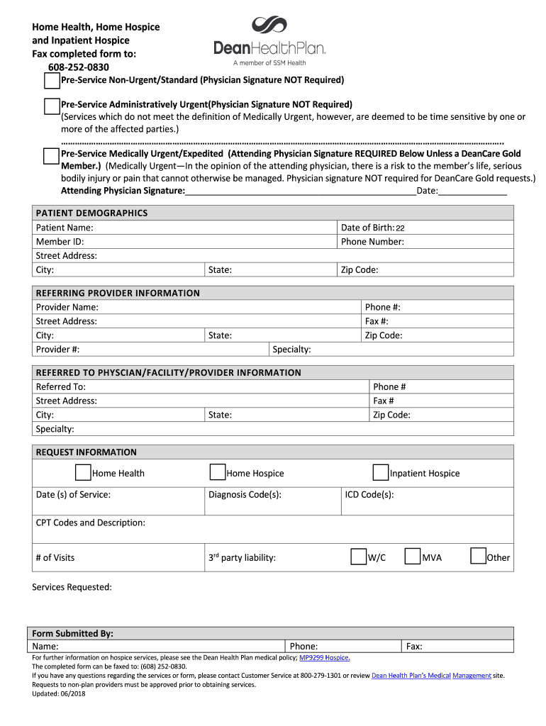 Home Health, Home Hospice and Inpatient Hospice Fax completed form to: 6082520830PreService Monument/Standard (Physician Signature NOT Required)PreService Administratively Urgent(Physician Signature
