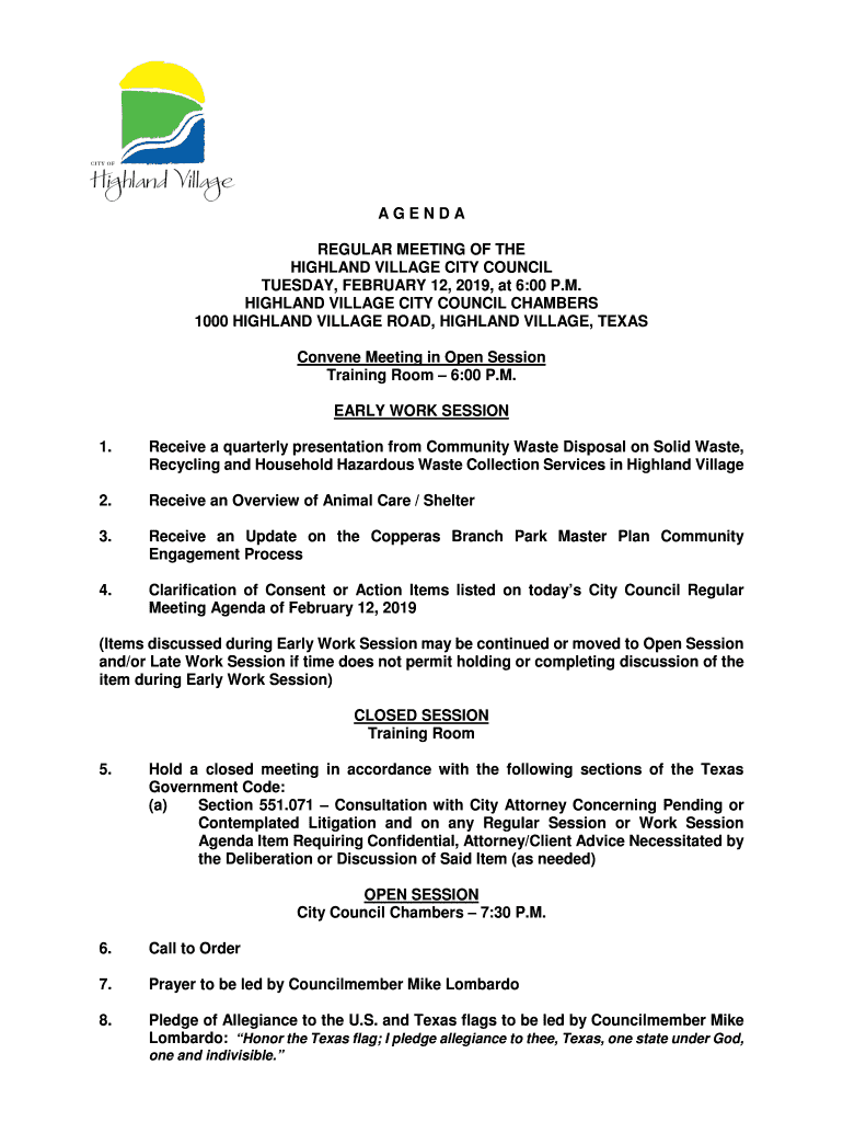 AGENDA REGULAR MEETING OF THE HIGHLAND VILLAGE CITY COUNCIL TUESDAY, FEBRUARY 12, 2019, at 6:00 P.M. HIGHLAND VILLAGE CITY COUNCIL CHAMBERS 1000 HIGHLAND VILLAGE ROAD, HIGHLAND VILLAGE, TEXAS Convene