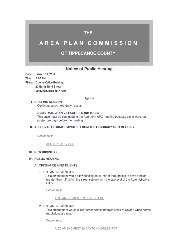 OF TIPPECANOE COUNTYNotice of Public Hearing