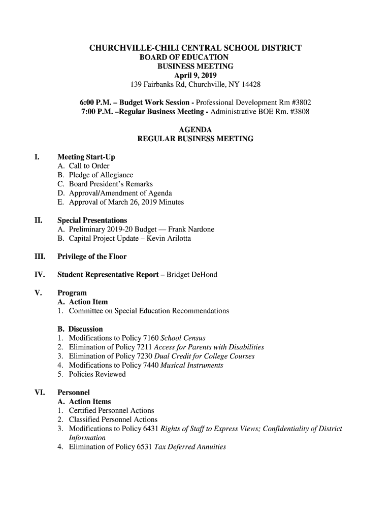 CHURCHVILLECHILI CENTRAL SCHOOL DISTRICT BOARD OF EDUCATION BUSINESS MEETING April 9, 2019 139 Fairbanks Rd, Churchill, NY 14428 6:00 P.M. Budget Work Session Professional Development Rm #3802 7:00