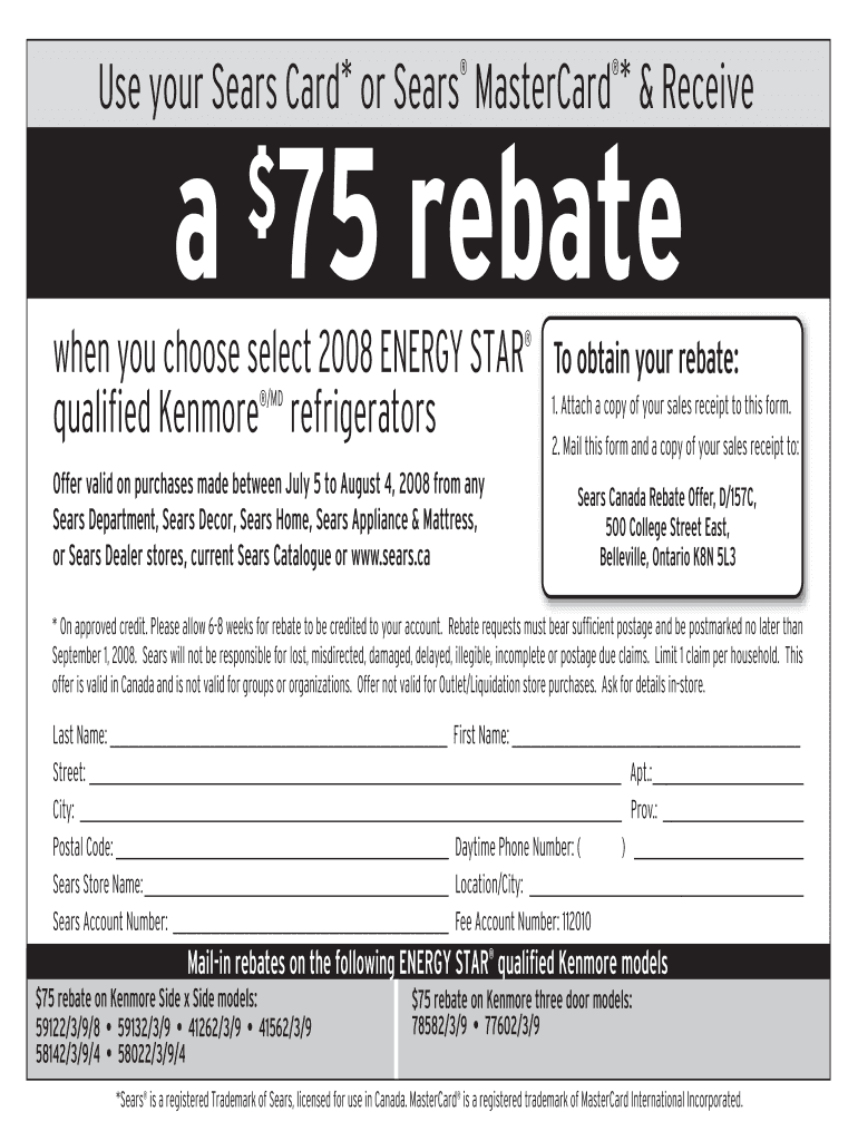Use your Sears Card* or Sears MasterCard * & Receive a ×75 rebate when you choose select 2008 ENERGY STAR qualified Kenmore refrigerators /MD Offer valid on purchases made between July 5 to August