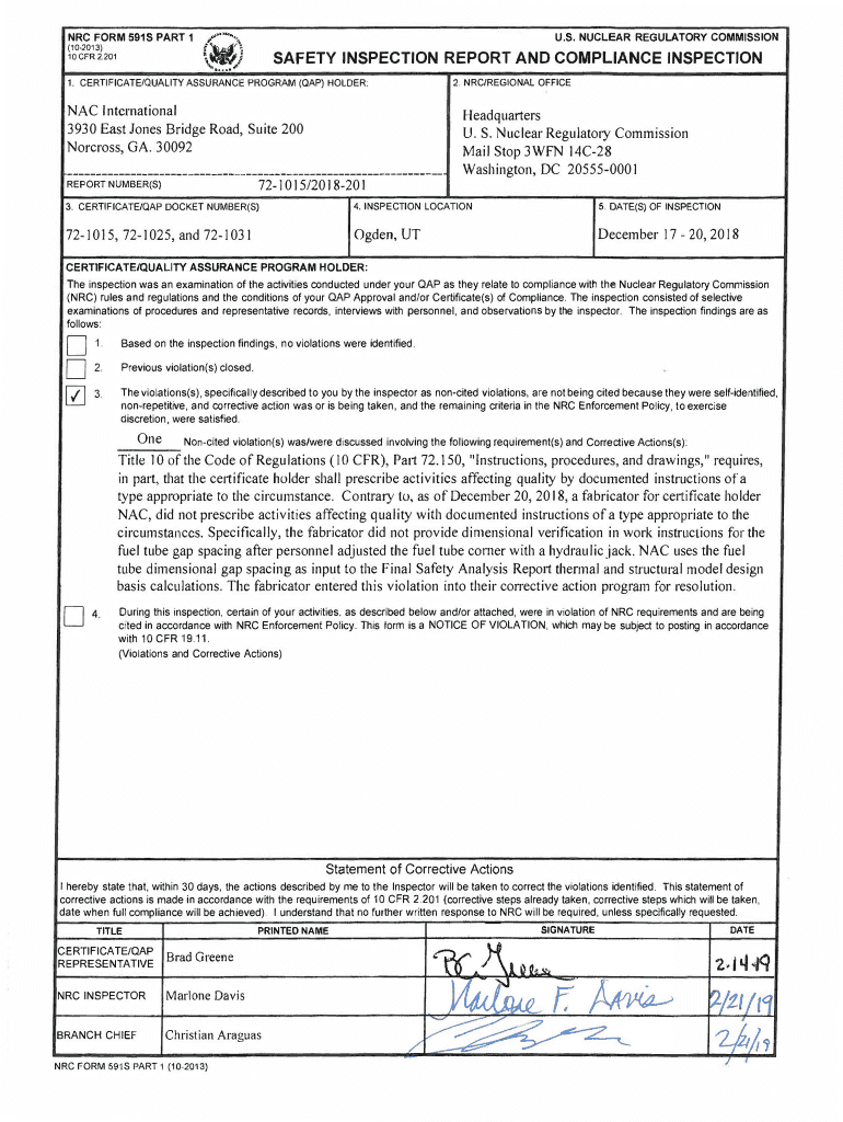 Get the free NAC International, Inc., NRC Form 591s Part 1, Inspection Report 07201015/2018201.
