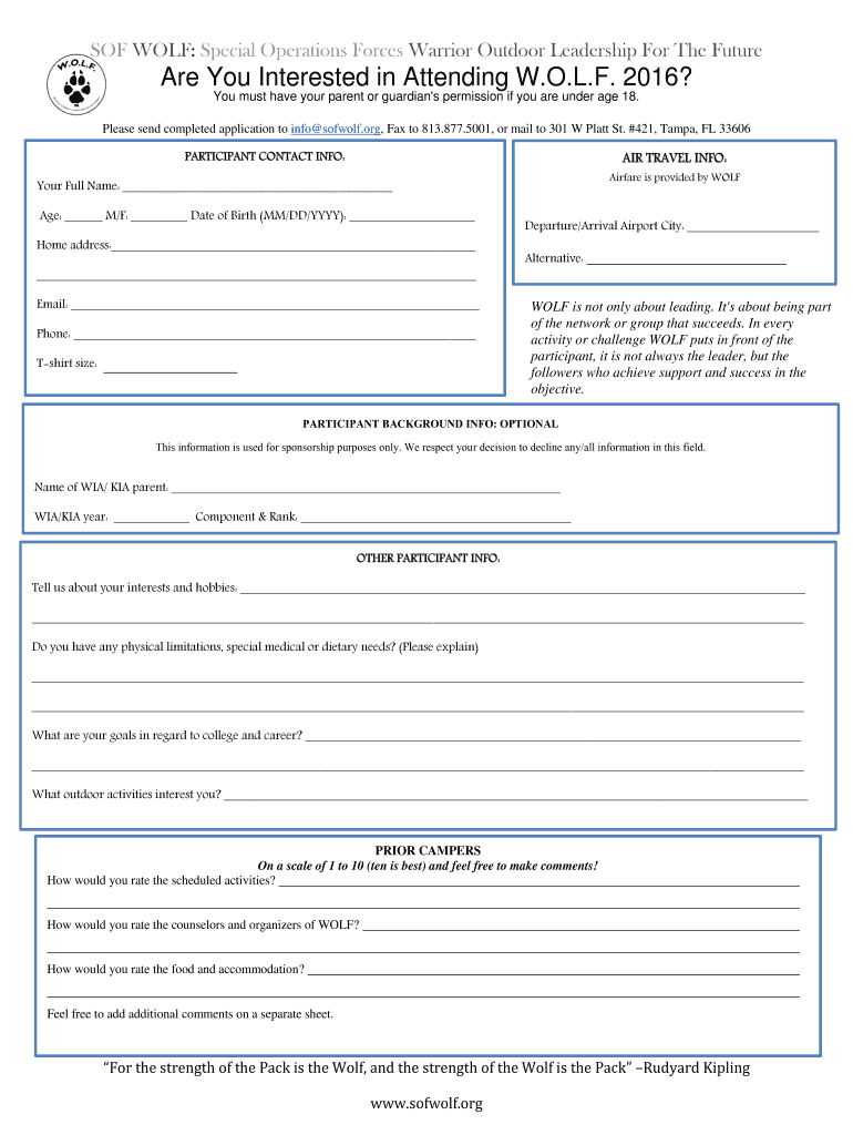 OF WOLF: Special Operations Forces Warrior Outdoor Leadership For The Future You Interested in Attending W.O.L.F. 2016? You must have your parent or guardian's permission if you are under age 18.
