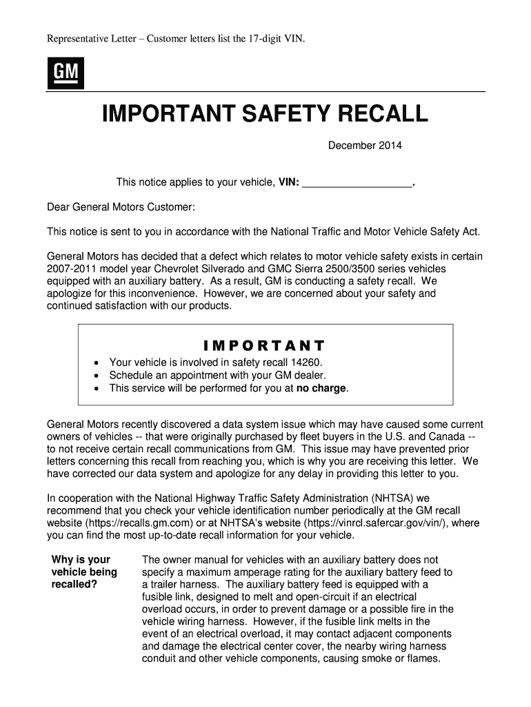 Representative Letter Customer letters list the 17digit VIN.IMPORTANT SAFETY RECALL December 2014 This notice applies to your vehicle, VIN:. Dear General Motors Customer: This notice is sent to you