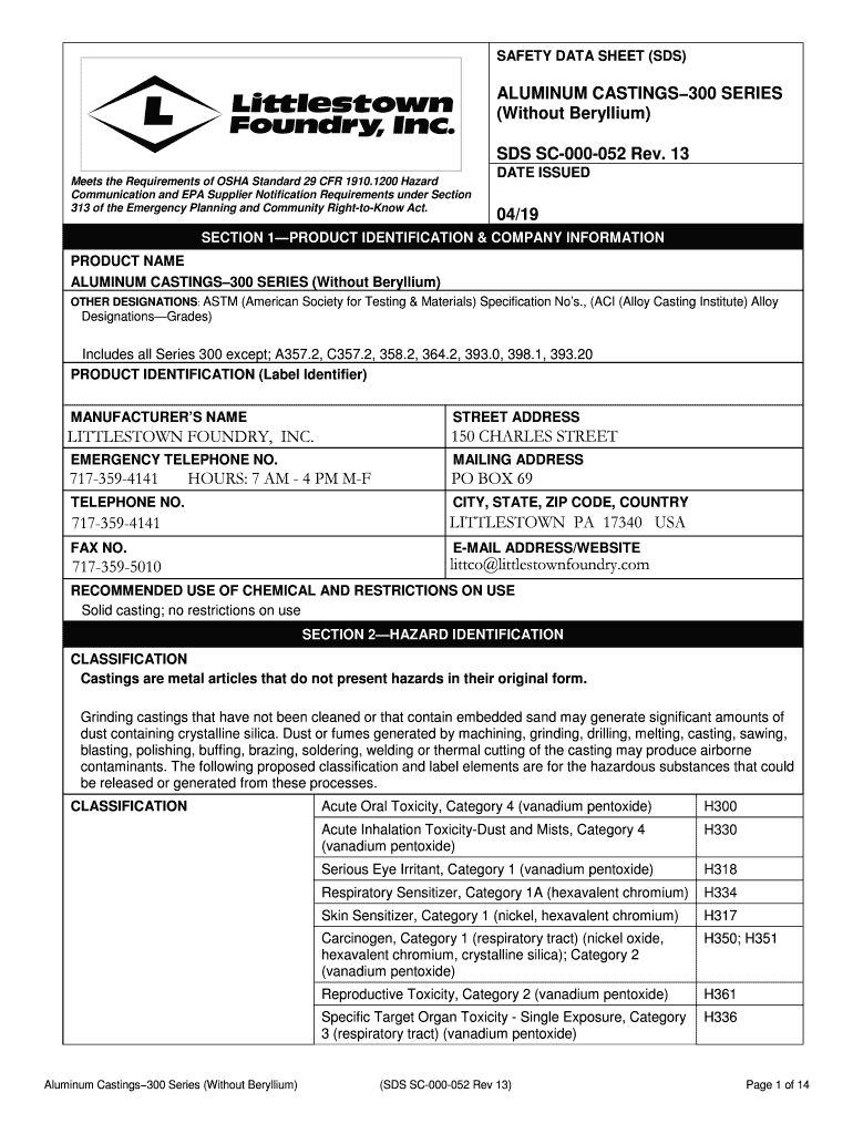 SAFETY DATA SHEET (SDS)ALUMINUM CASTINGS300 SERIES (Without Beryllium) SDS SC000052 Rev. 13 Meets the Requirements of OSHA Standard 29 CFR 1910.1200 Hazard Communication and EPA Supplier Notification