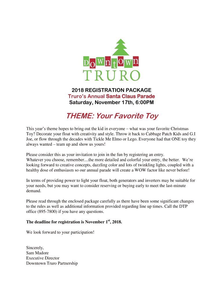 2018 REGISTRATION PACKAGE Turns Annual Santa Claus Parade Saturday, November 17th, 6:00PMTHEME: Your Favorite Toy This year's theme hopes to bring out the kid in everyone what was your favorite Christmas