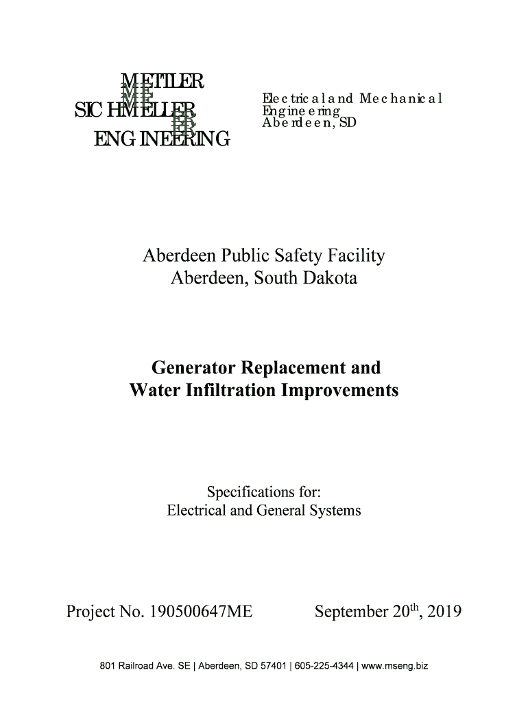 SETTLER ME MICHELLE ER, ER ENGINEERINGElectrical and Mechanical Engineering Aberdeen, SD Aberdeen Public Safety Facility Aberdeen, South DakotaGenerator Replacement and Water Infiltration ImprovementsSpecifications