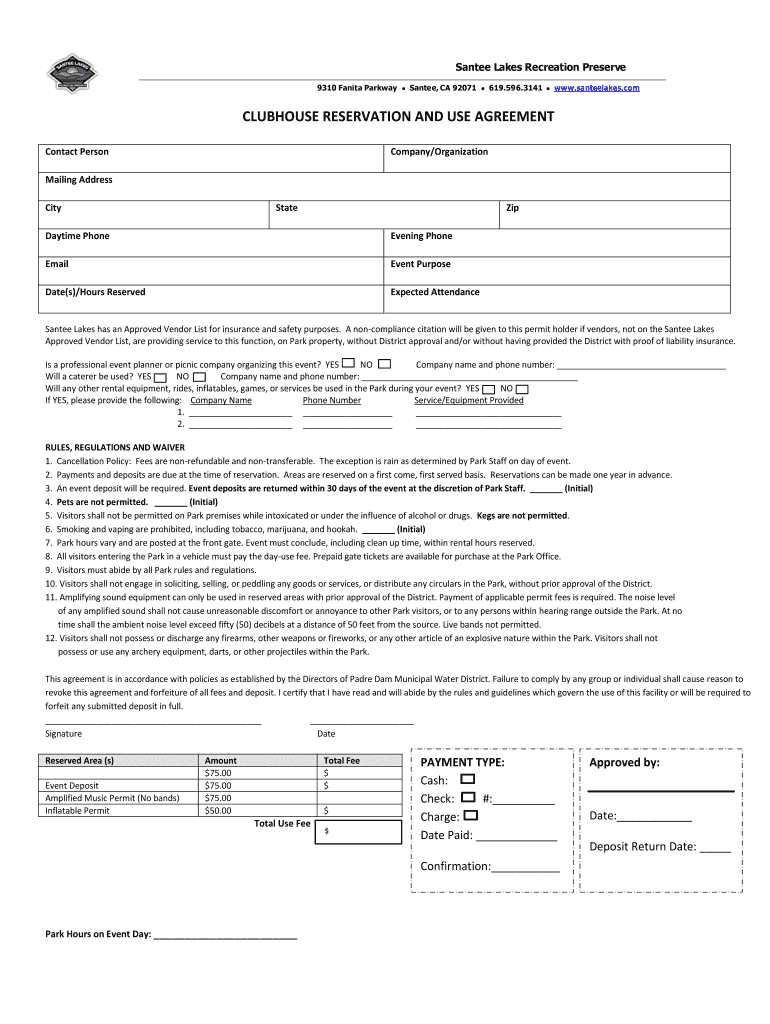 9310 Anita ParkwaySantee, CA 92071619.596.3141www.santeelakes.clubhouse RESERVATION AND USE AGREEMENT
