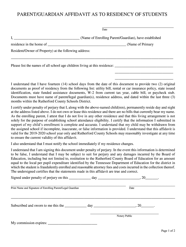 PARENT/GUARDIAN AFFIDAVIT AS TO RESIDENCY OF STUDENTS Dates, (Name of Enrolling Parent/Guardian), have established residence in the home of (Name of Primary Resident/Owner of Property) at the following