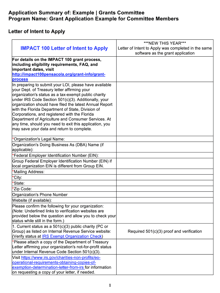 Application Summary of: Example Grants Committee Program Name: Grant Application Example for Committee Members Letter of Intent to Apply ***NEW THIS YEAR*** Letter of Intent to Apply was completed