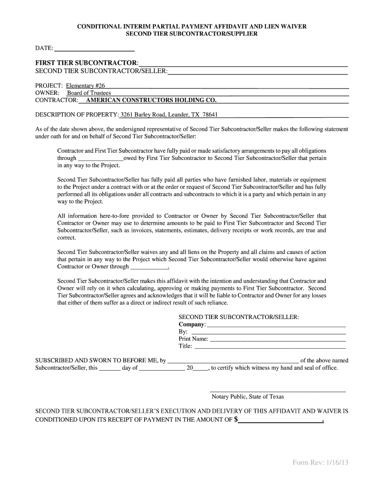 CONDITIONAL INTERIM PARTIAL PAYMENT AFFIDAVIT AND LIEN WAIVER