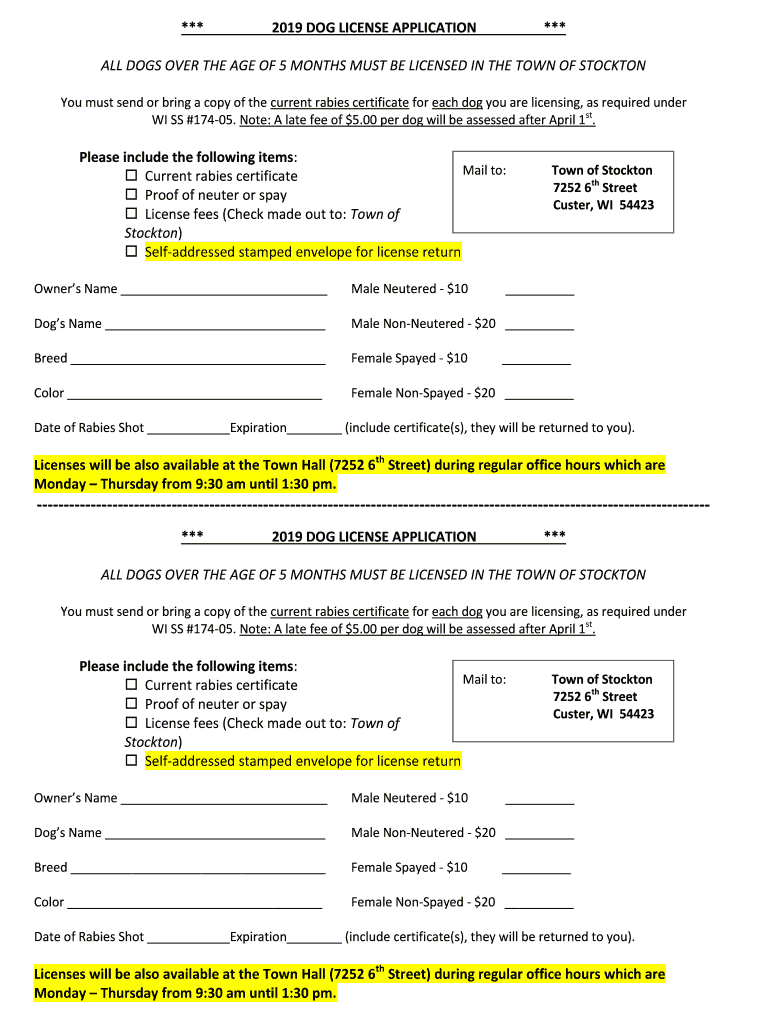 ***2019 DOG LICENSE APPLICATION***ALL DOGS OVER THE AGE OF 5 MONTHS MUST BE LICENSED IN THE TOWN OF STOCKTON You must send or bring a copy of the current rabies certificate for each dog you are licensing,