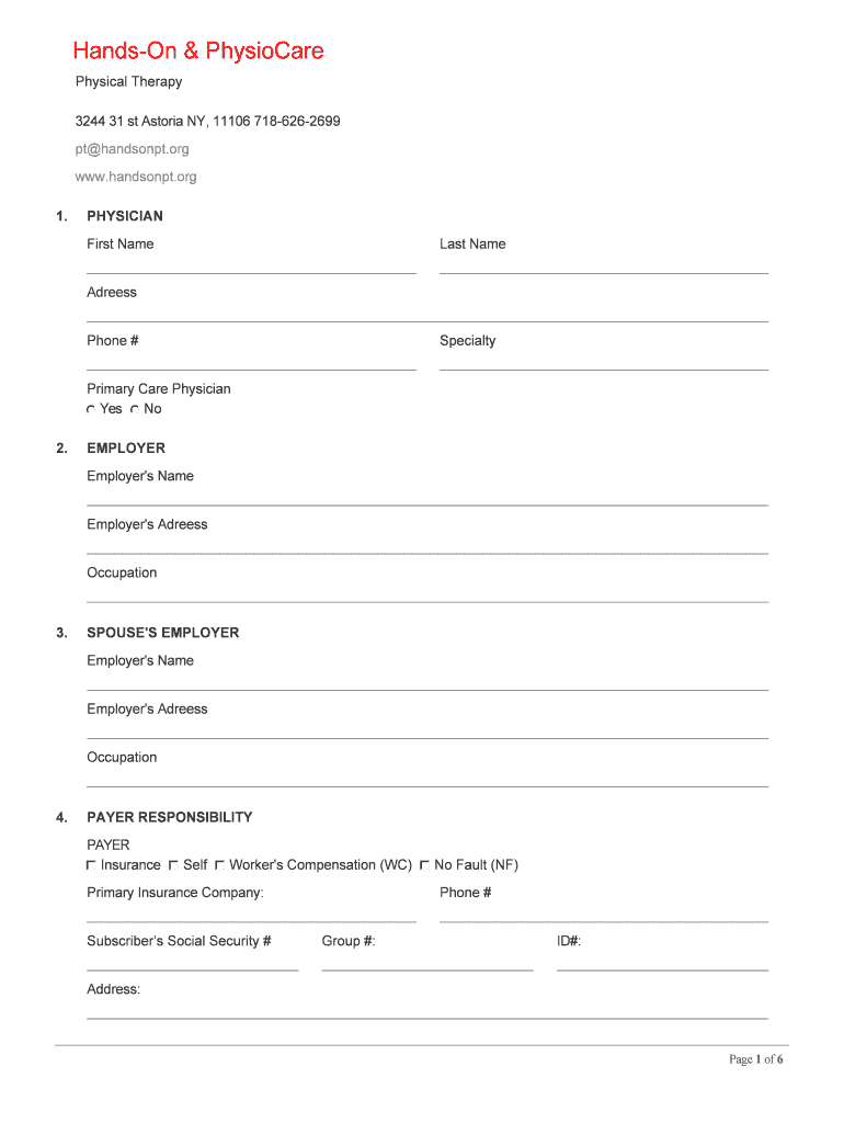 Hanson & Physical Therapy 3244 31st Astoria NY, 11106 7186262699 pt handsome.org www.handsonpt.org 1.PHYSICIAN First Nameless NameAdreess Phone #SpecialtyPrimary Care Physician Yes No 2.EMPLOYER's