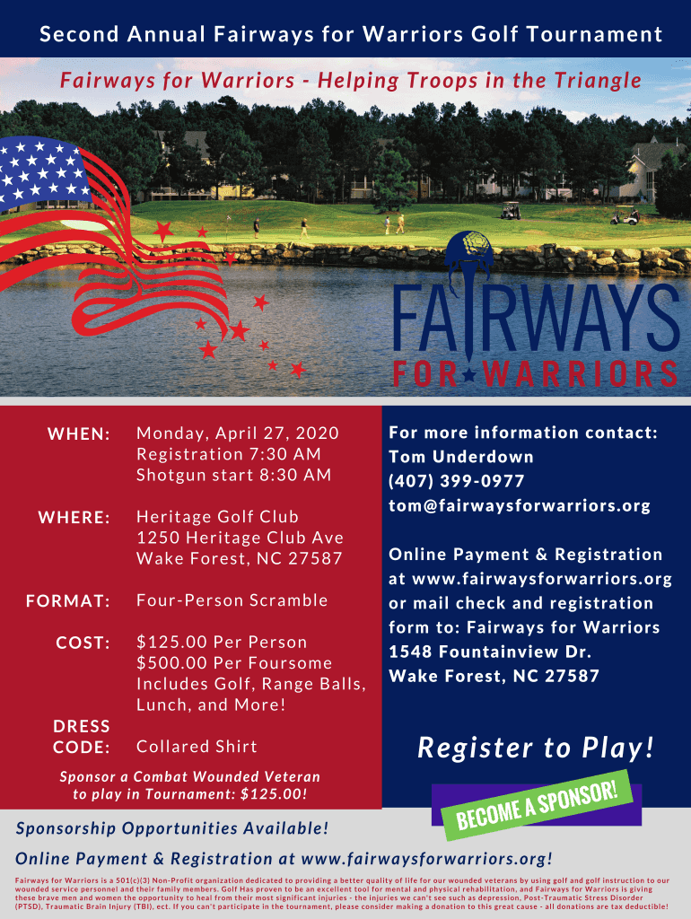 Second Annual Fairways for Warriors Golf Tournament Fairways for Warriors Helping Troops in the TriangleWHEN:Monday, April 27, 2020, Registration 7:30 AM Shotgun start 8:30 WHERE:Heritage Golf Club