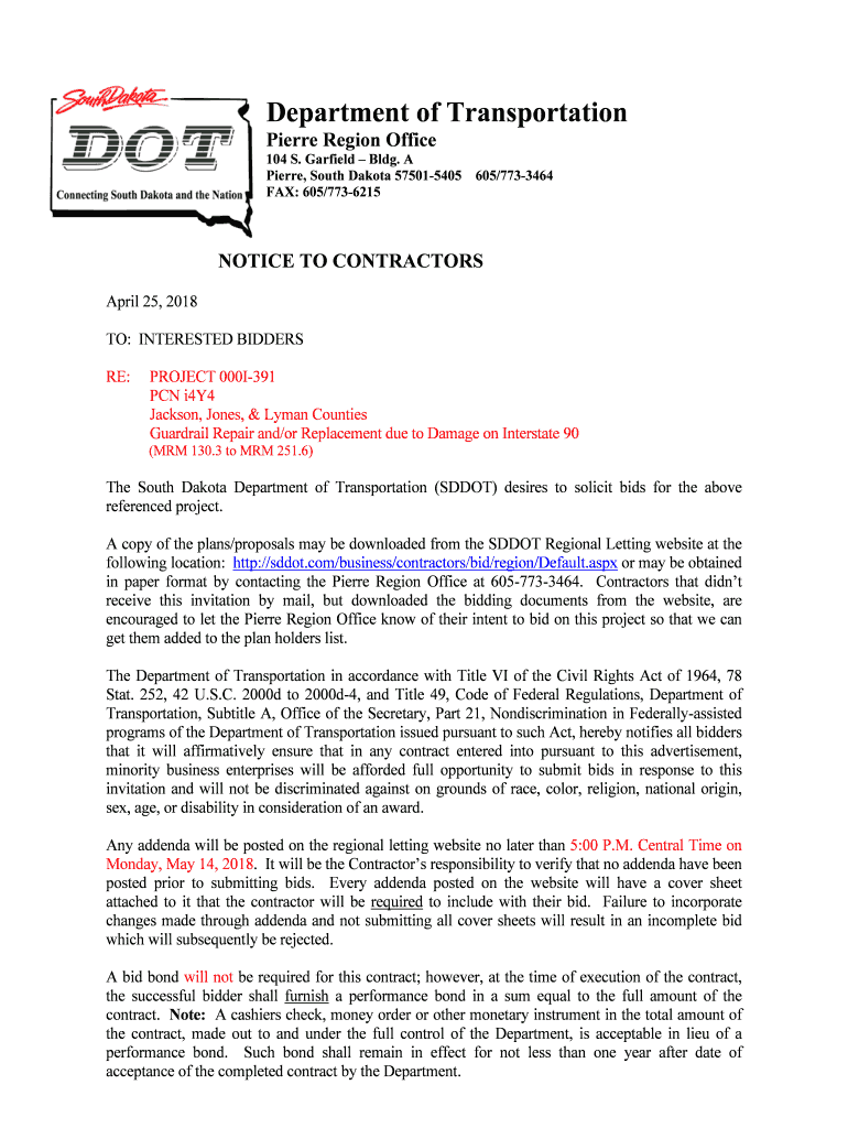 Department of Transportation Pierre Region Office 104 S. Garfield Bldg. A Pierre, South Dakota 575015405 FAX: 605/7736215605/7733464NOTICE TO CONTRACTORS April 25, 2018, TO: INTERESTED BIDDERS RE:PROJECT