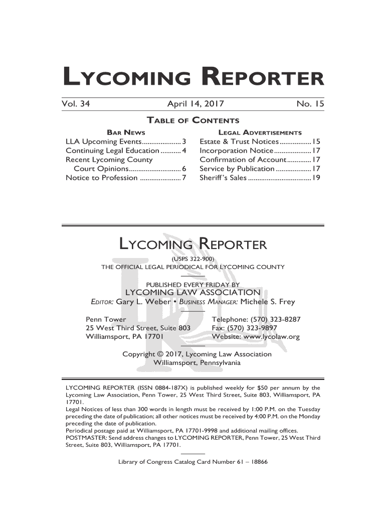 Lycoming Reporter Vol. 34April 14, 2017No. 15Table of Contents Bar News LA Upcoming Events...................... 3 Continuing Legal Education............ 4 Recent Lycoming County Court Opinions.............................