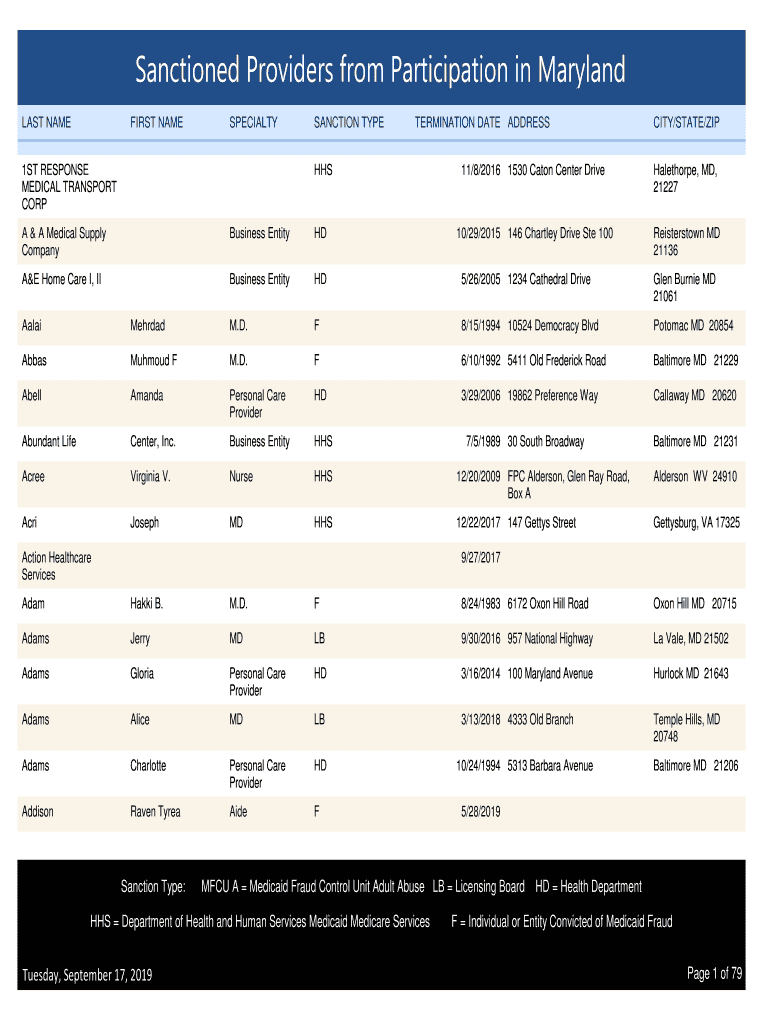 Sanctioned Providers from Participation in Maryland LAST NAMEFIRST NAMESPECIALTY1ST RESPONSE MEDICAL TRANSPORT COMPACTION DETERMINATION DATE ADDRESSHHSCITY/STATE/ZIP11/8/2016 1530 Canon Center DriveHalethorpe,