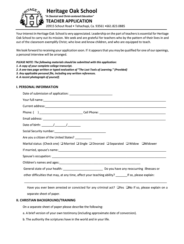 Get the free Teacher Application - Heritage Oak School