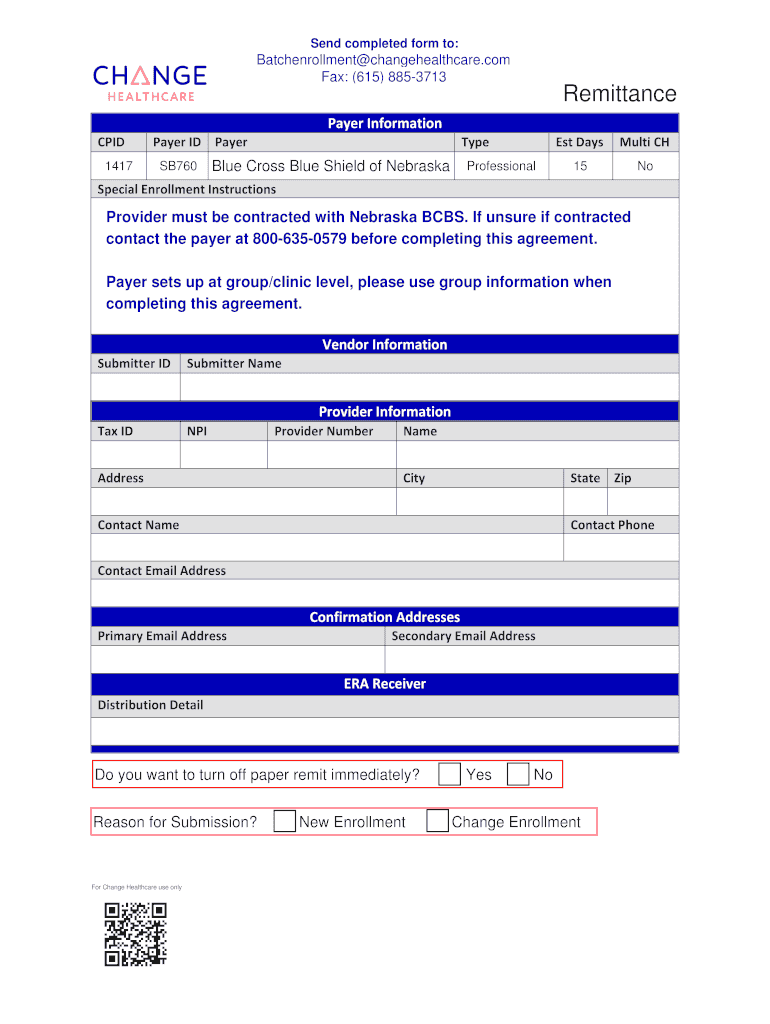 Send completed form to:Batch enrollment changehealthcare.com Fax: (615) 8853713RemittancePayerInformation CPI 1417PayerID Payer Type SB760 Blue Cross Blue Shield of Nebraska ProfessionalEstDays Multics