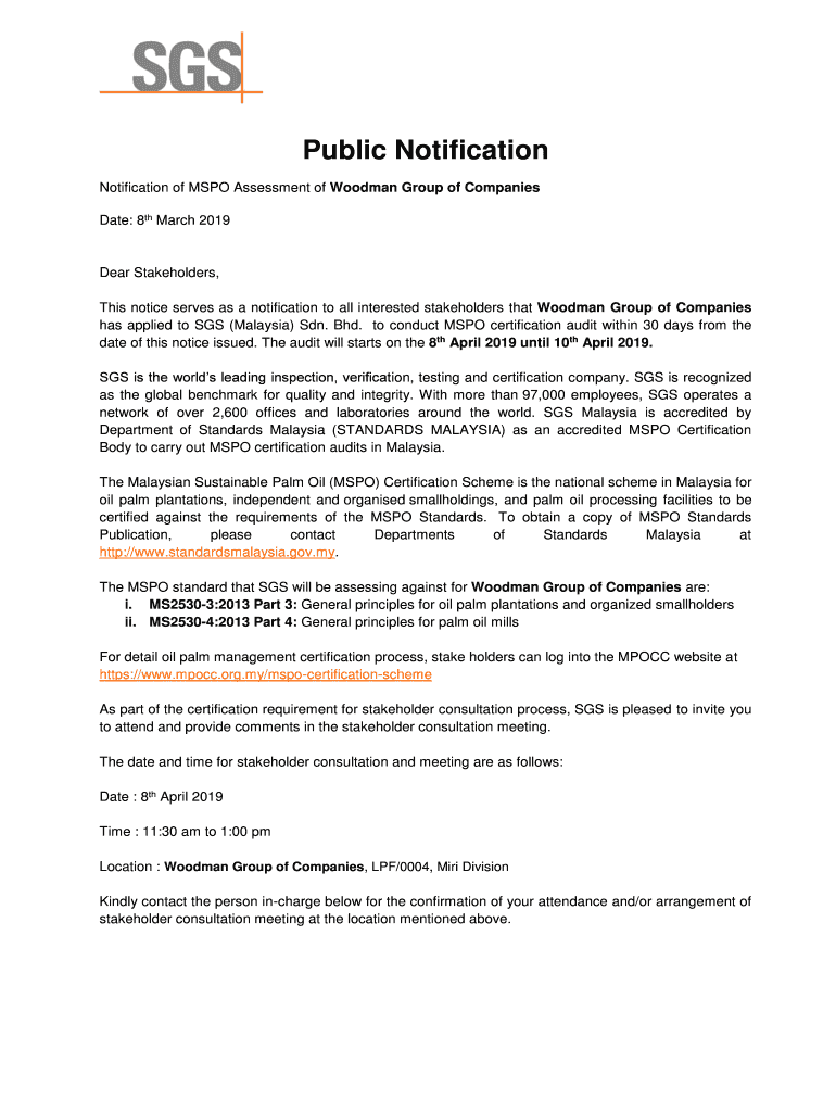 This notice serves as a notification to all interested stakeholders that Woodman Group of