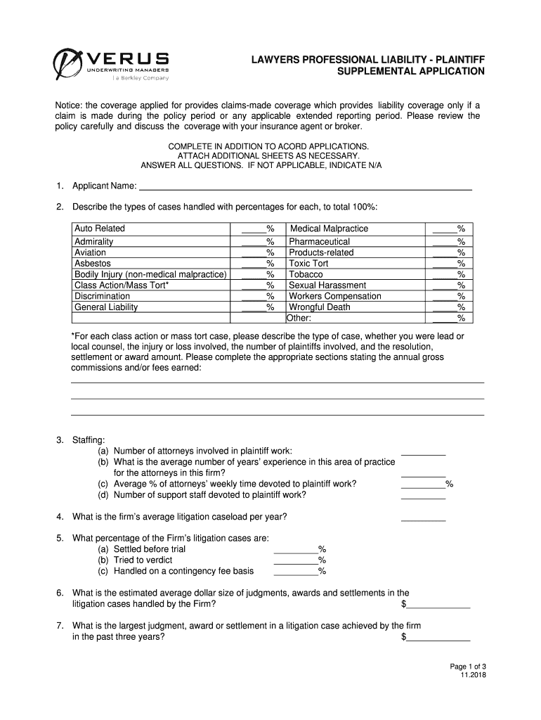 LAWYERS PROFESSIONAL LIABILITY PLAINTIFF SUPPLEMENTAL APPLICATIONNotice: the coverage applied for provides claims made coverage which provides liability coverage only if a claim is made during the