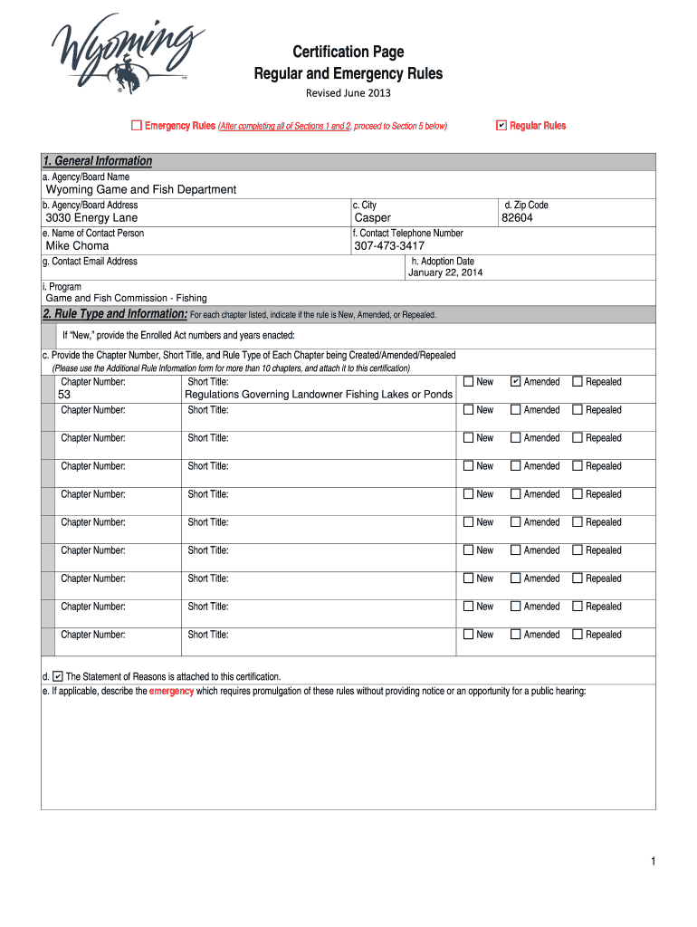 Certification Page Regular and Emergency Rules Revised June 2013 Emergency Rules (After completing all Sections 1 and 2, proceed to Section 5 below)Regular Rules1. General Information a. Agency/Board