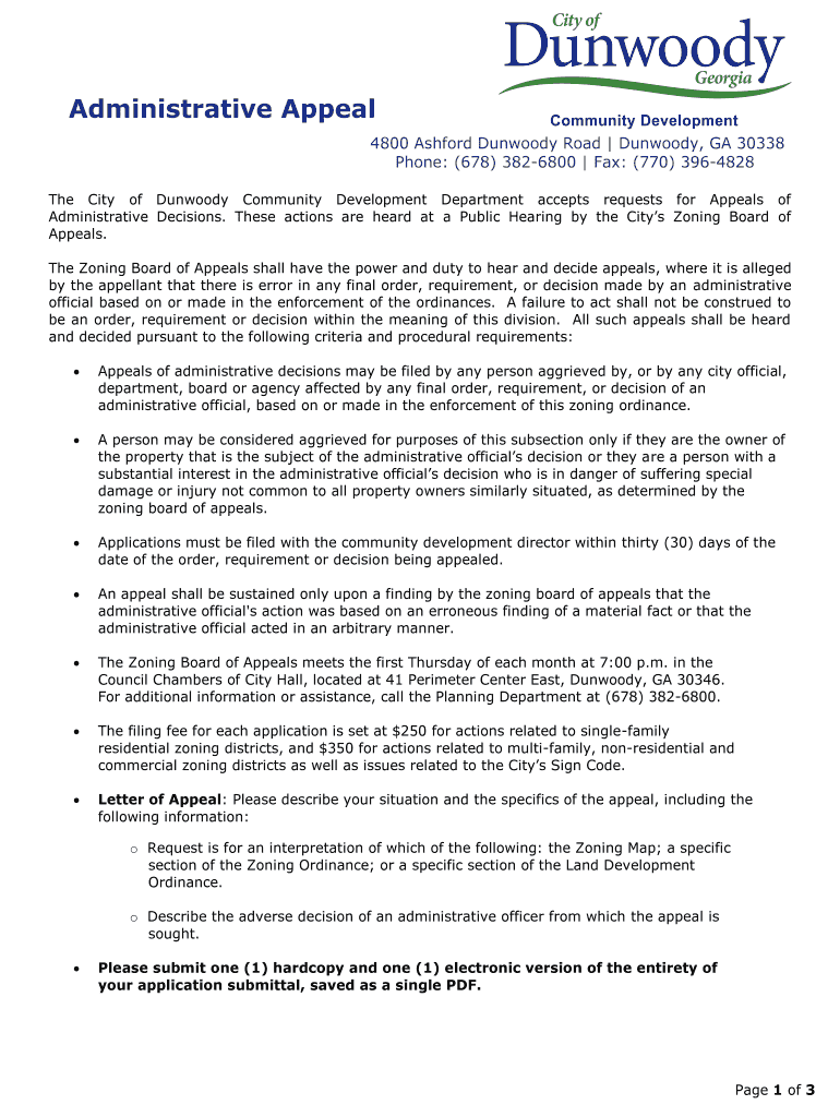 Administrative Appeal 4800 Ashford Dunwoody Road Dunwoody, GA 30338 Phone: (678) 3826800 Fax: (770) 3964828 The City of Dunwoody Community Development Department accepts requests for Appeals of Administrative
