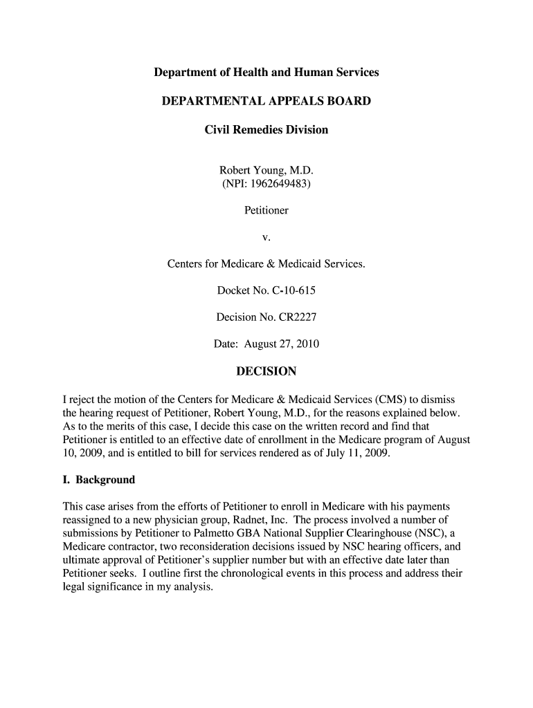 Department of Health and Human Services DEPARTMENTAL APPEALS BOARD Civil Remedies Division Robert Young, M.D. (NPI: 1962649483) Petitioner v. Centers for Medicare & Medicaid Services. Docket No. C10615