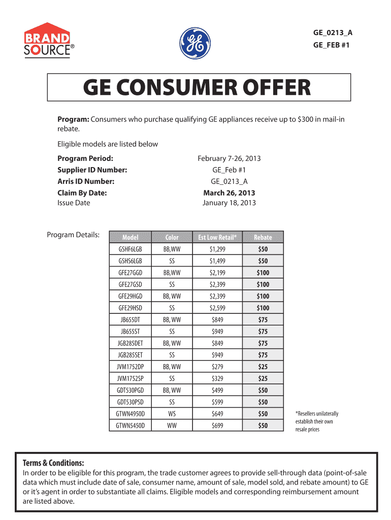 GE 0213 A GE FEB #1GE CONSUMER OFFERProgram: Consumers who purchase qualifying GE appliances receive up to $300 in mailinrebate. Eligible models are listed belowProgram Period:February 726, 2013 Supplier