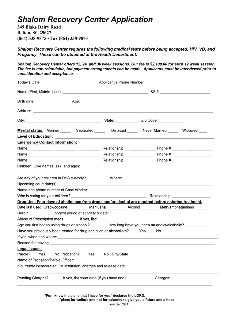 ShalomRecoveryCenterApplication 349BlakeDairyRoad Belton,SC29627 (864)3389875Fax(864)3389876 ShalomRecoveryCenterrequiresthefollowingmedicaltestsbeforebeingaccepted:HIV, VD, and Pregnancy. ThesecanbeobtainedattheHealthDepartment.