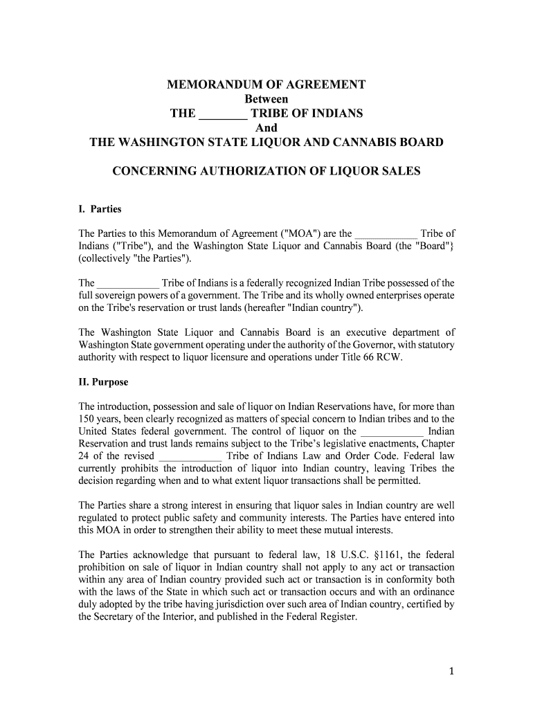 MEMORANDUM OF AGREEMENT Between THE TRIBE OF INDIANS And THE WASHINGTON STATE LIQUOR AND CANNABIS BOARD CONCERNING AUTHORIZATION OF LIQUOR SALES I. Parties The Parties to this Memorandum of Agreement