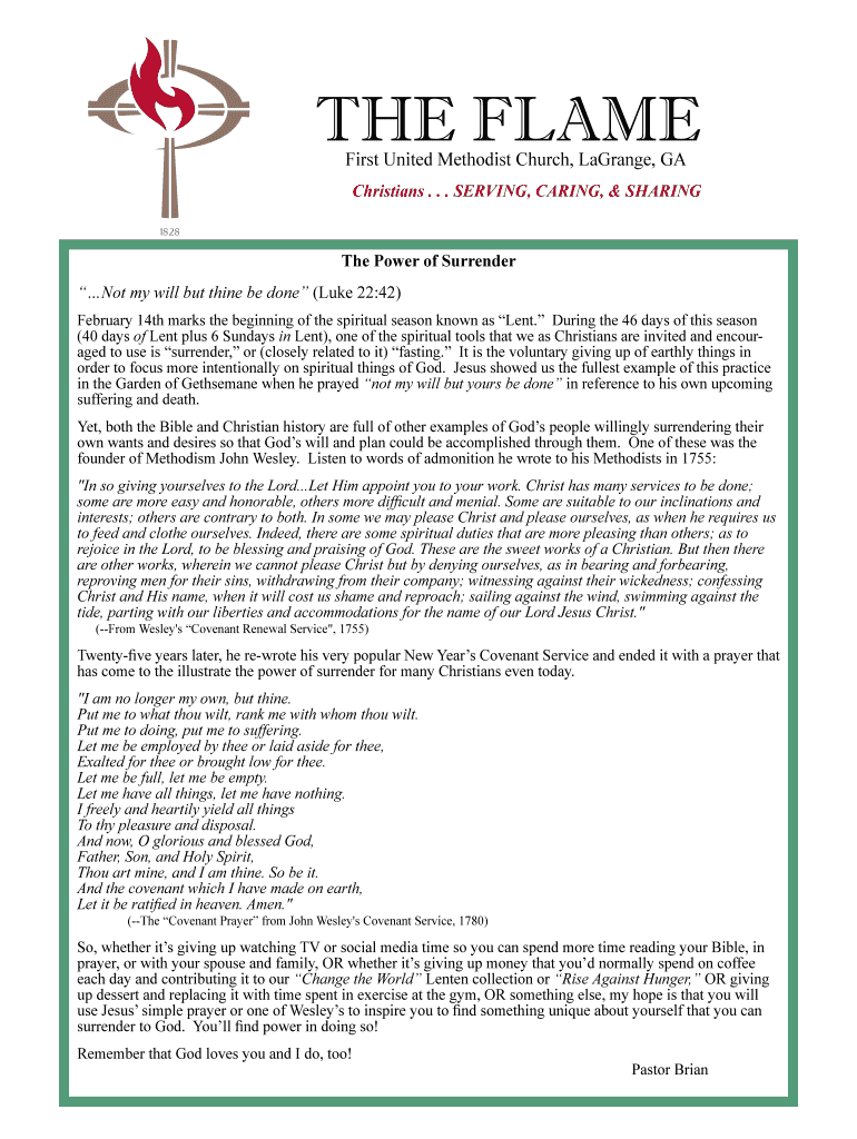 THE FLAME First United Methodist Church, LaGrange, GA Christians. . . SERVING, CARING, & Sharing Power of Surrender Not my will but thine be done (Luke 22:42) February 14th marks the beginning of