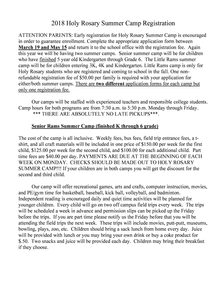 ATTENTION PARENTS: Early registration for Holy Rosary Summer Camp is encouraged