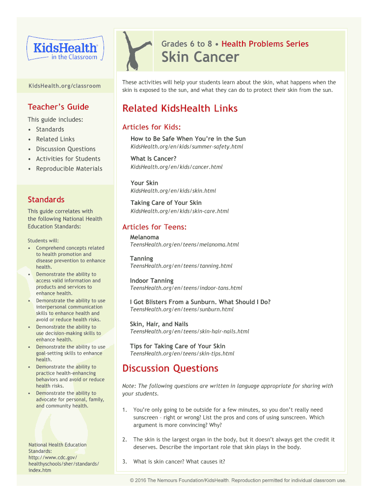 Grades 6 to 8 Health Problems SeriesSkin Cancer KidsHealth.org/classroomThese activities will help your students learn about the skin, what happens when the skin is exposed to the sun, and what they